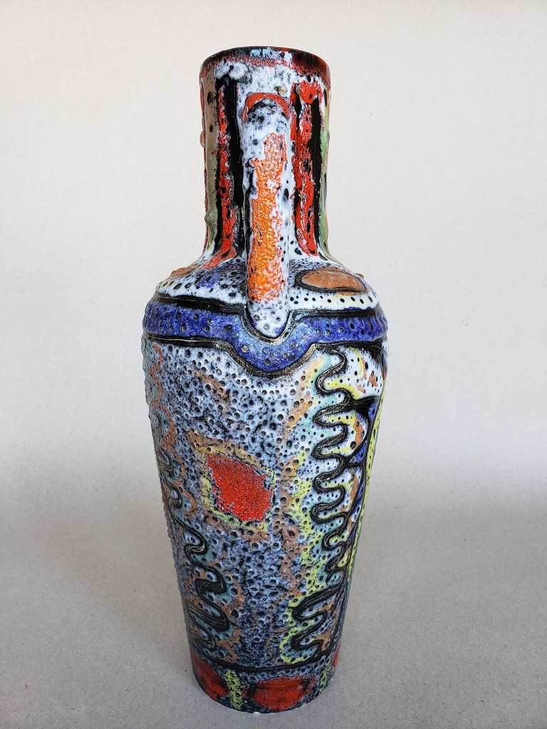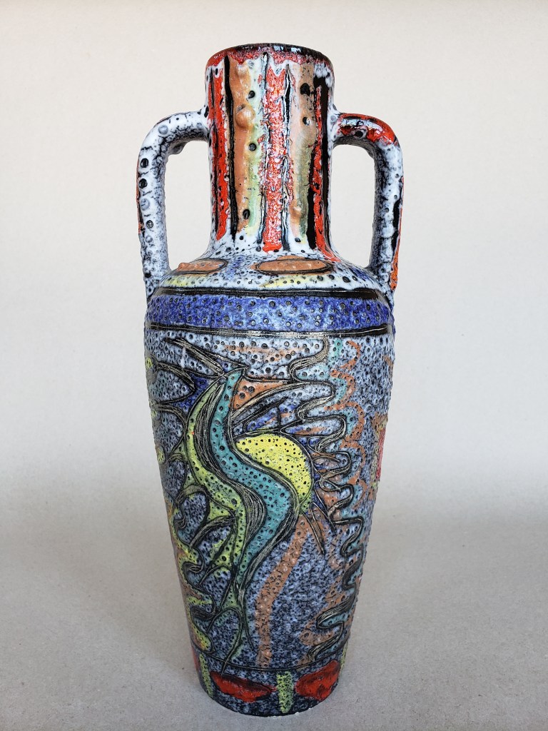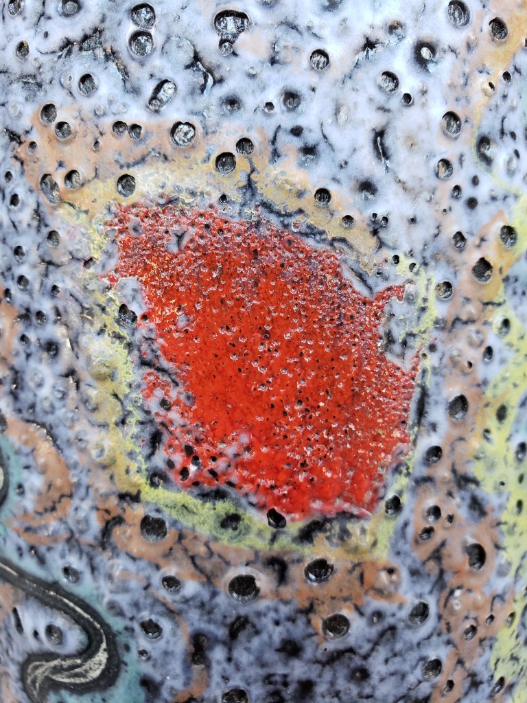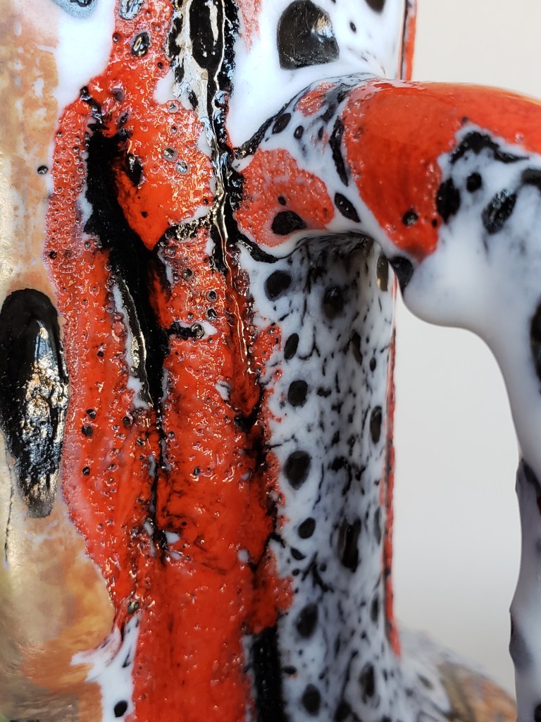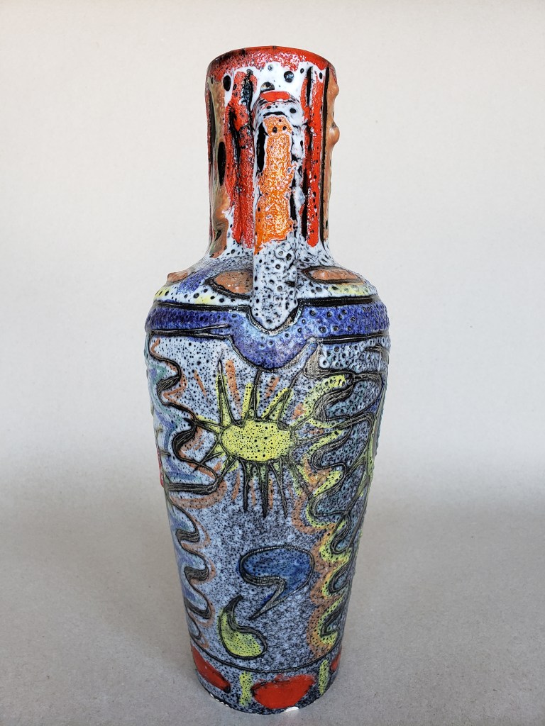 Sometimes you see something so intriguing you just buy it and ask questions later. Such is the case with the unknown party here, which came out of France. It has some of the hallmarks of Marius Bessone, the Vallauris ceramist known for his signed works featuring organic, primary-colored shapes etched onto a background of foamy white. Alas, this piece has only a faint white “V” (probably standing for Vallauris) on the base, so it is unlikely to be his. Nevertheless, it is a wonder to behold, with the natural world present in features such as the ameoba-like red spot and a neck like a gnarled tree oozing sap. Made by an unknown artist, peut-être, but not one lacking in talent.