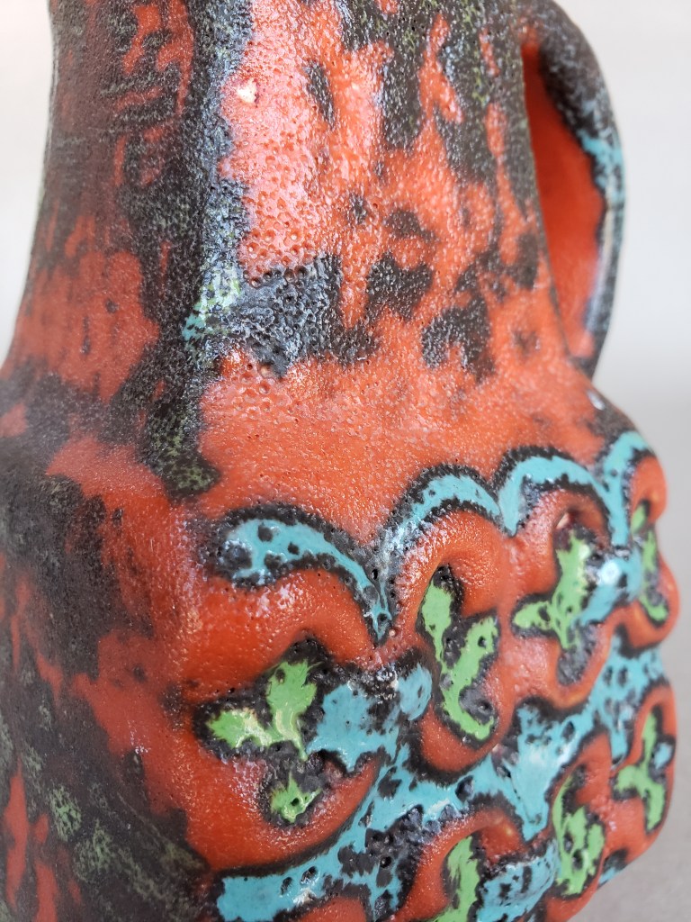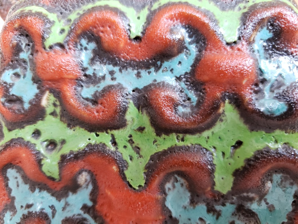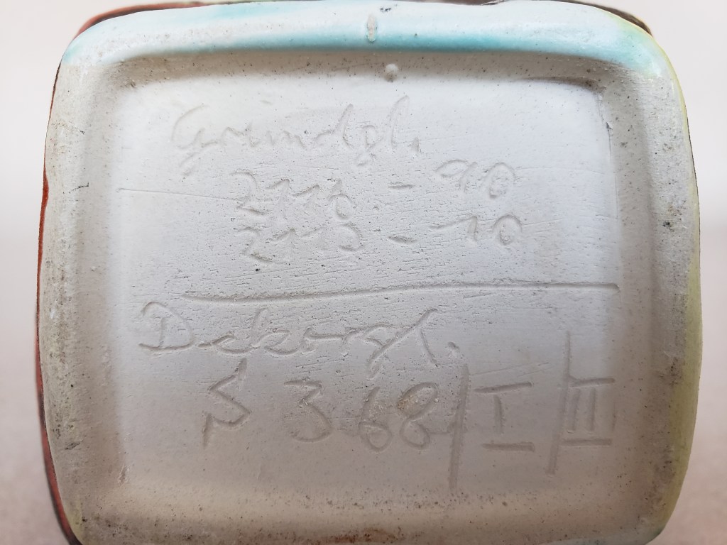 This little friend was sitting unloved on the internet, with no one willing to adopt him. I imagine all the other vases with him had been looked at, oohed and aahed over, and then given good homes… but with his slightly frumpy shape, odd colors and lack of pedigree (no molded base markings), he was never destined to be the pick of the litter. But sometimes it takes just the right person to come along and fall in love, and so it was when we met. But what a surprise there was for me when he arrived! The bottom contained a handwritten “Grundgl.” and “Dekorgl.” — German shorthand for base glaze (glasur) and final glaze. In combination with the numbers, this identified the vase as a one-of-a-kind test piece. Pedigree, indeed! I wouldn’t trade him in for all the world.