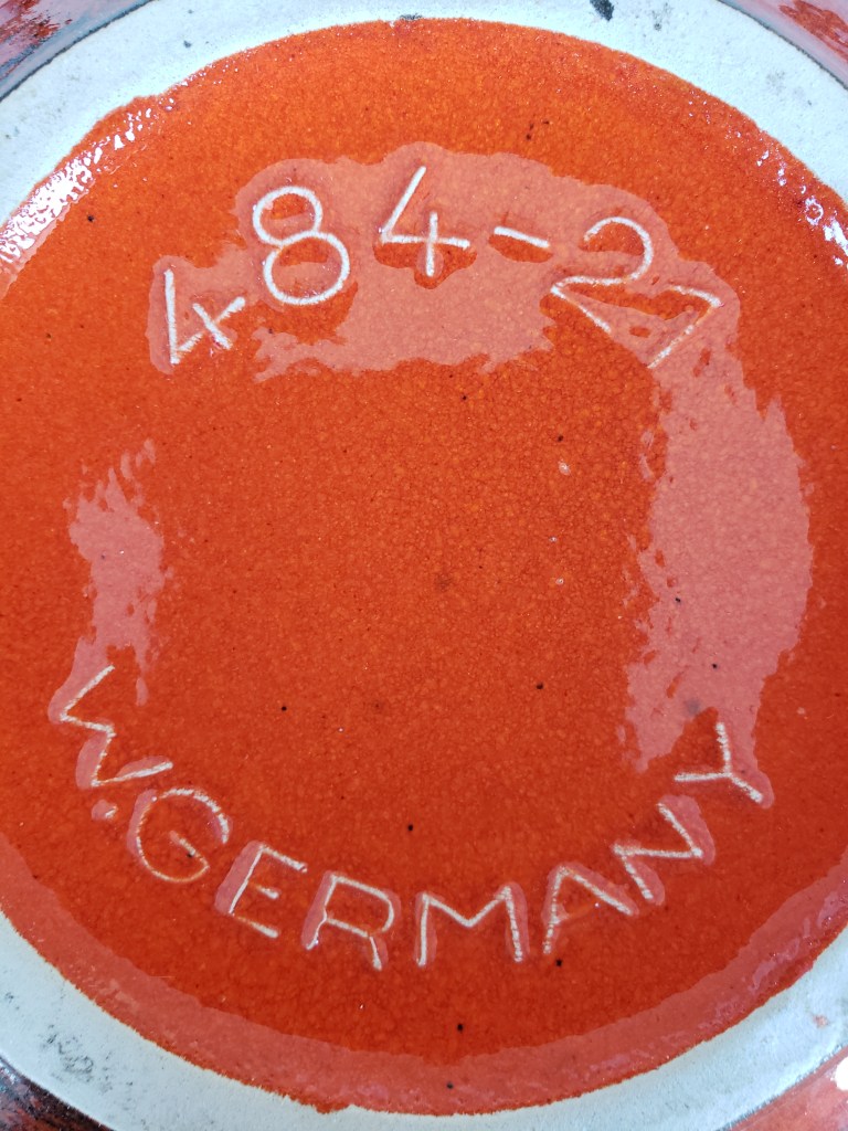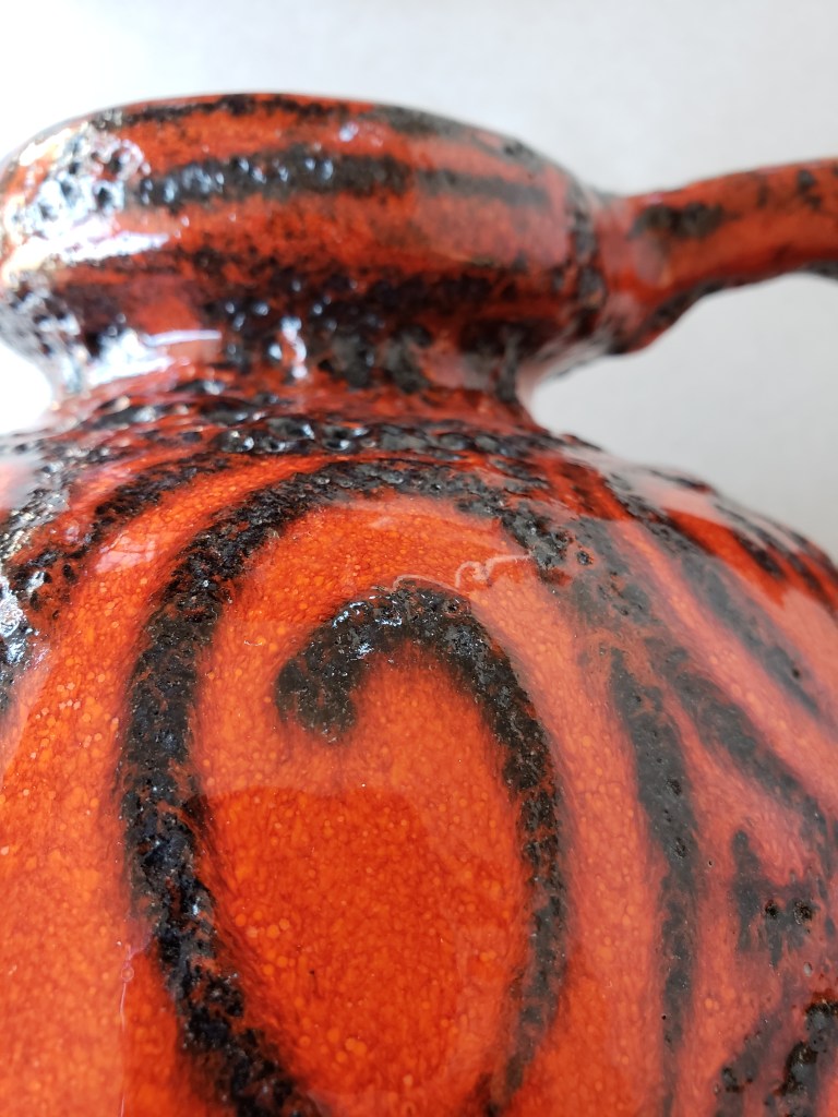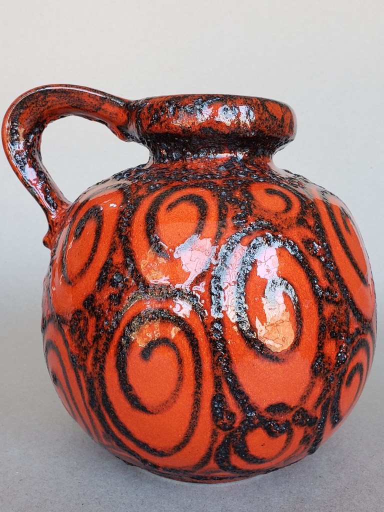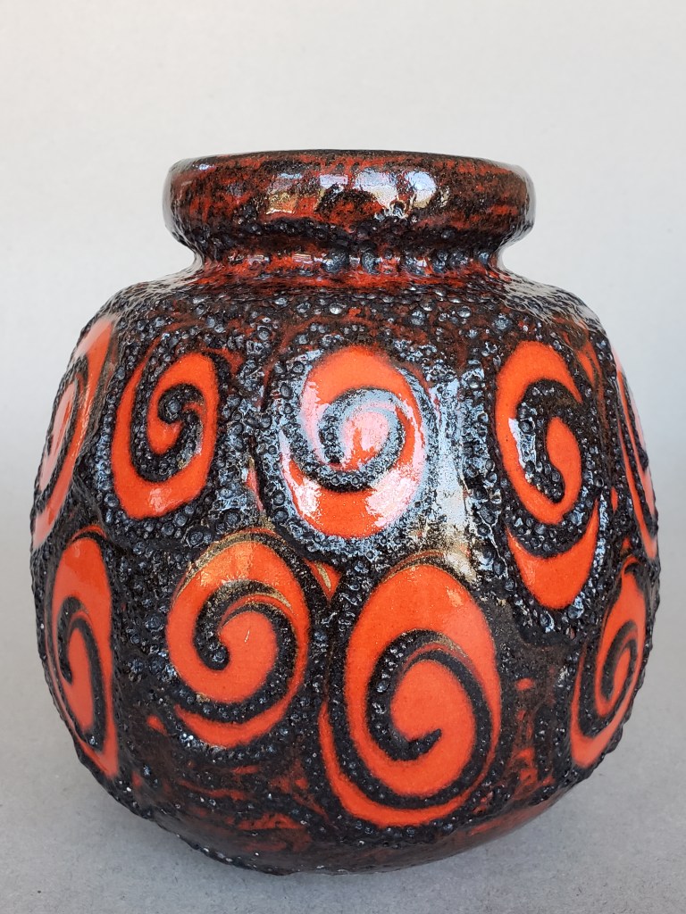 Hurricanes, with their counter-clockwise movement, would seem to have been the inspiration for this arresting yet simple decor. It can be found on at least 3-4 other Scheurich forms and tends to vary (as can be seen above) quite a bit in the application of the black, tube-lined glaze. It’s a reminder of the human element: The artisans who decorated these struggled with the same day-to-day issues (bills, relationships) we all do. Having a good day? It’s all sunshine and warm breezes in the swirls on the 484. Having a bad day? Look out, little 284… I see dark clouds on the horizon.