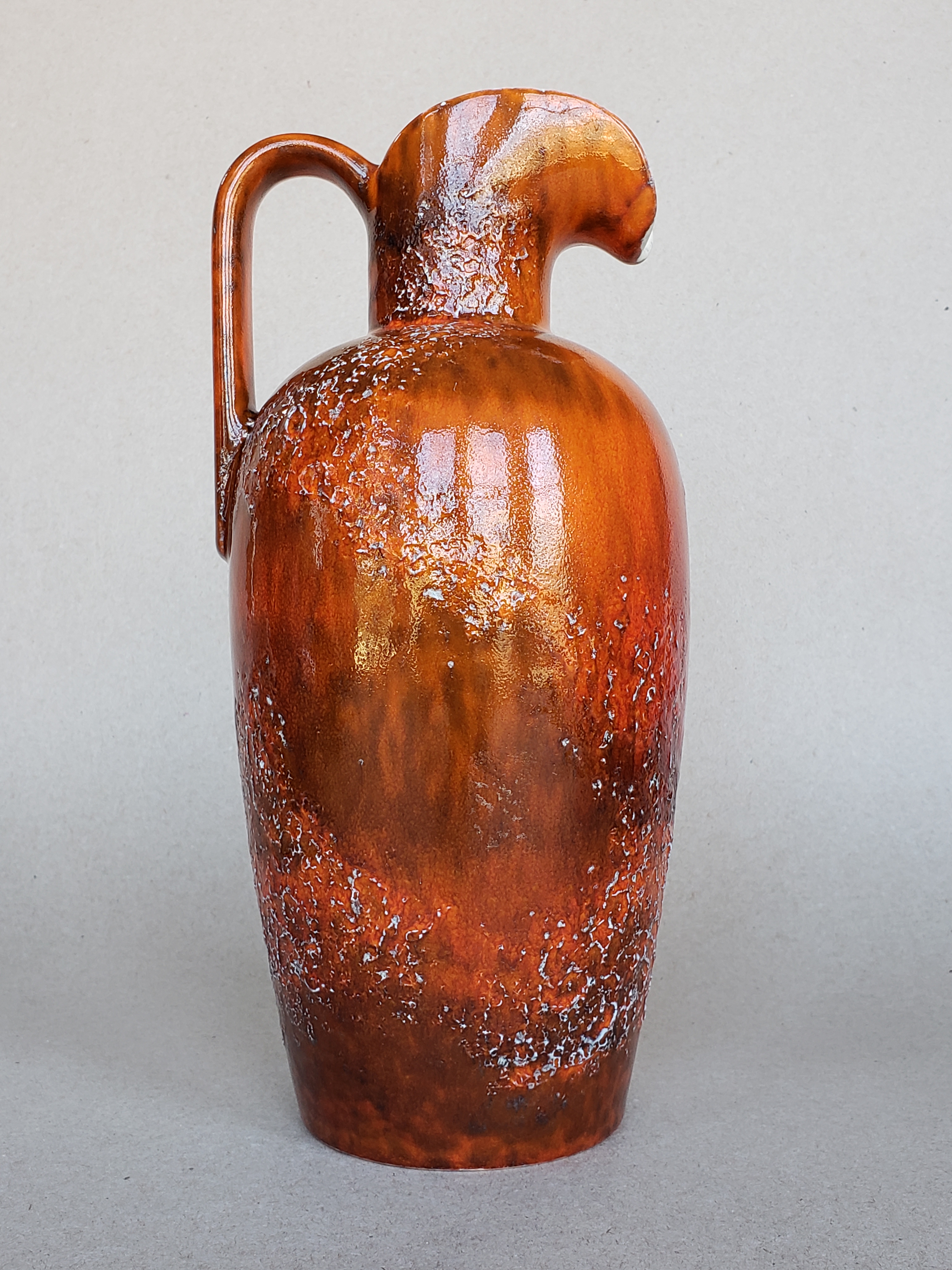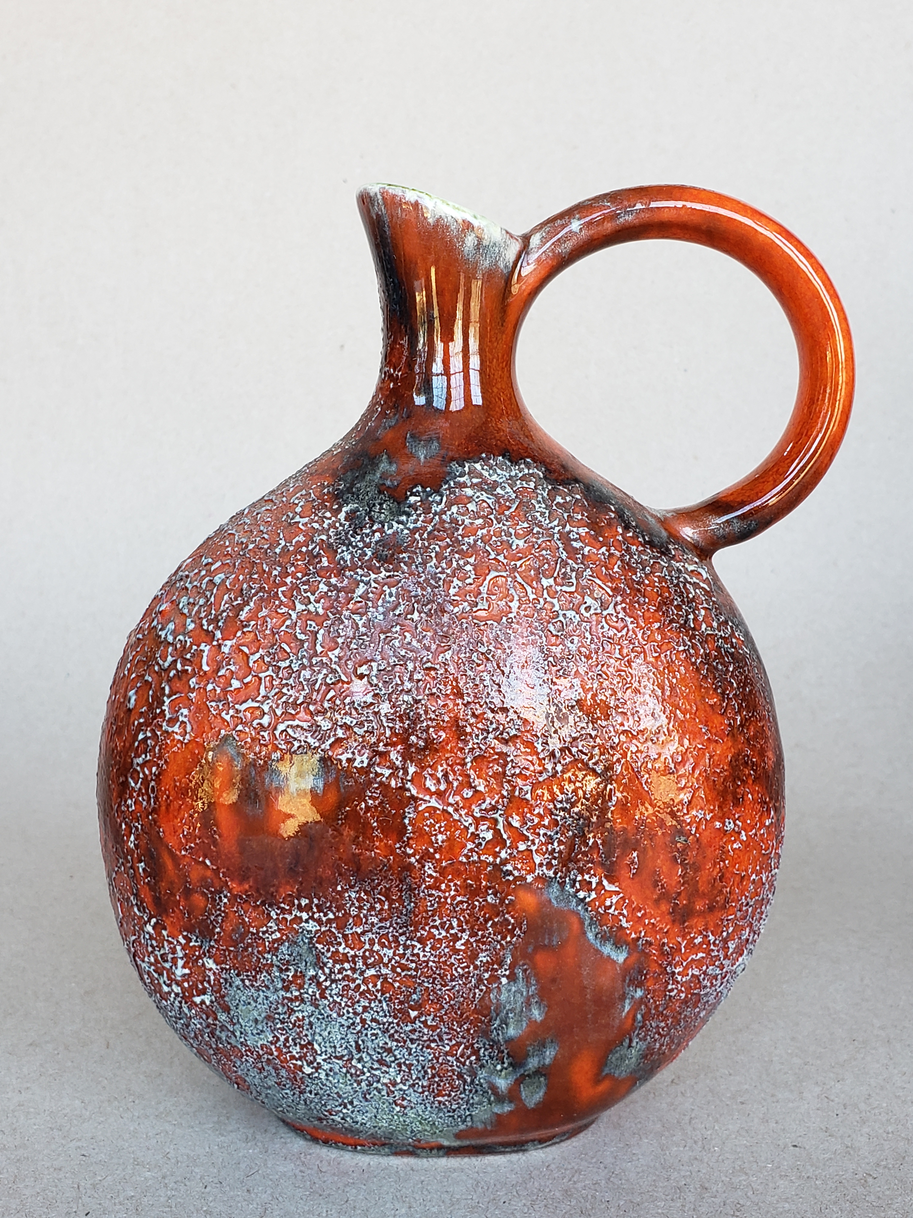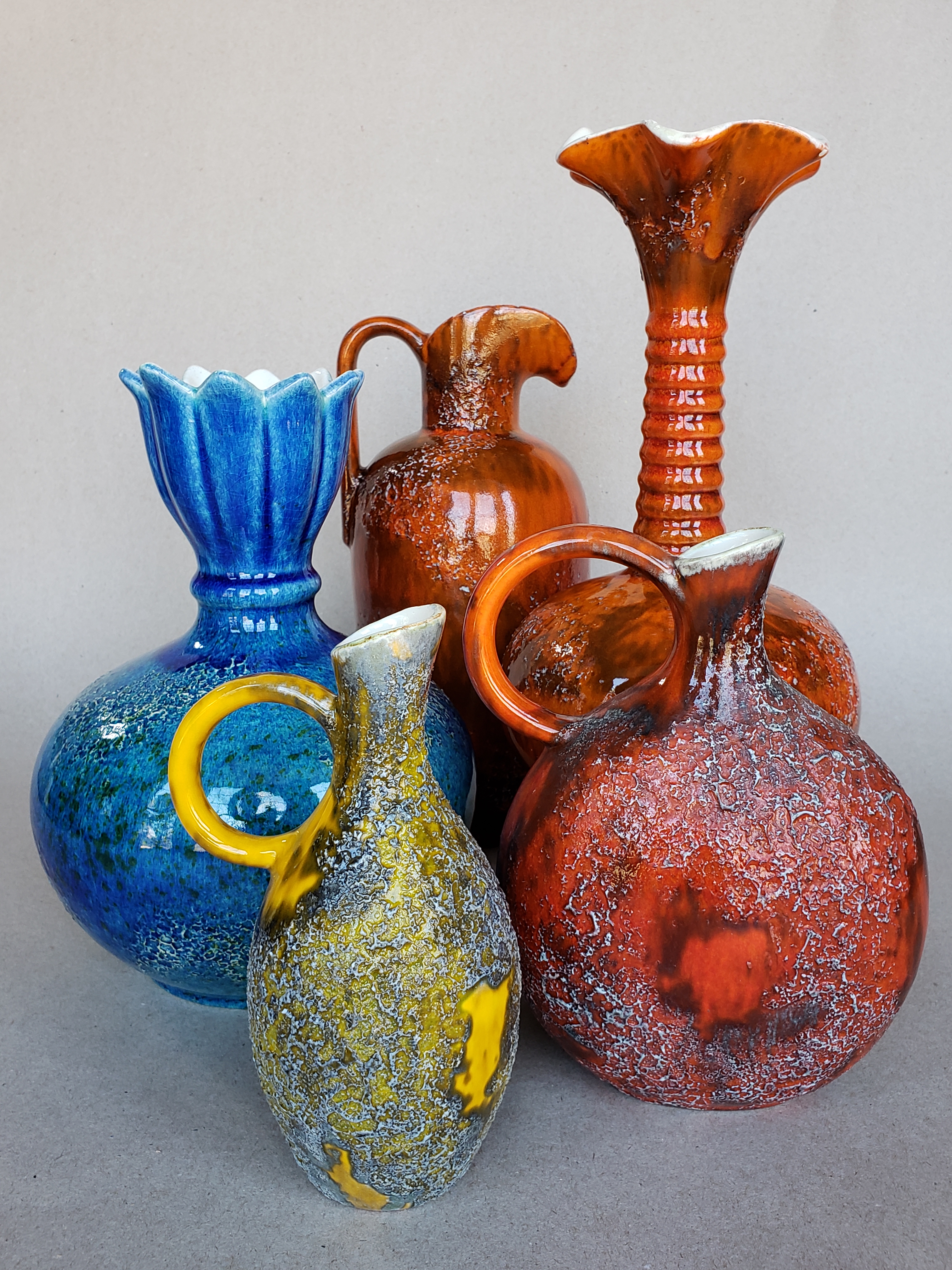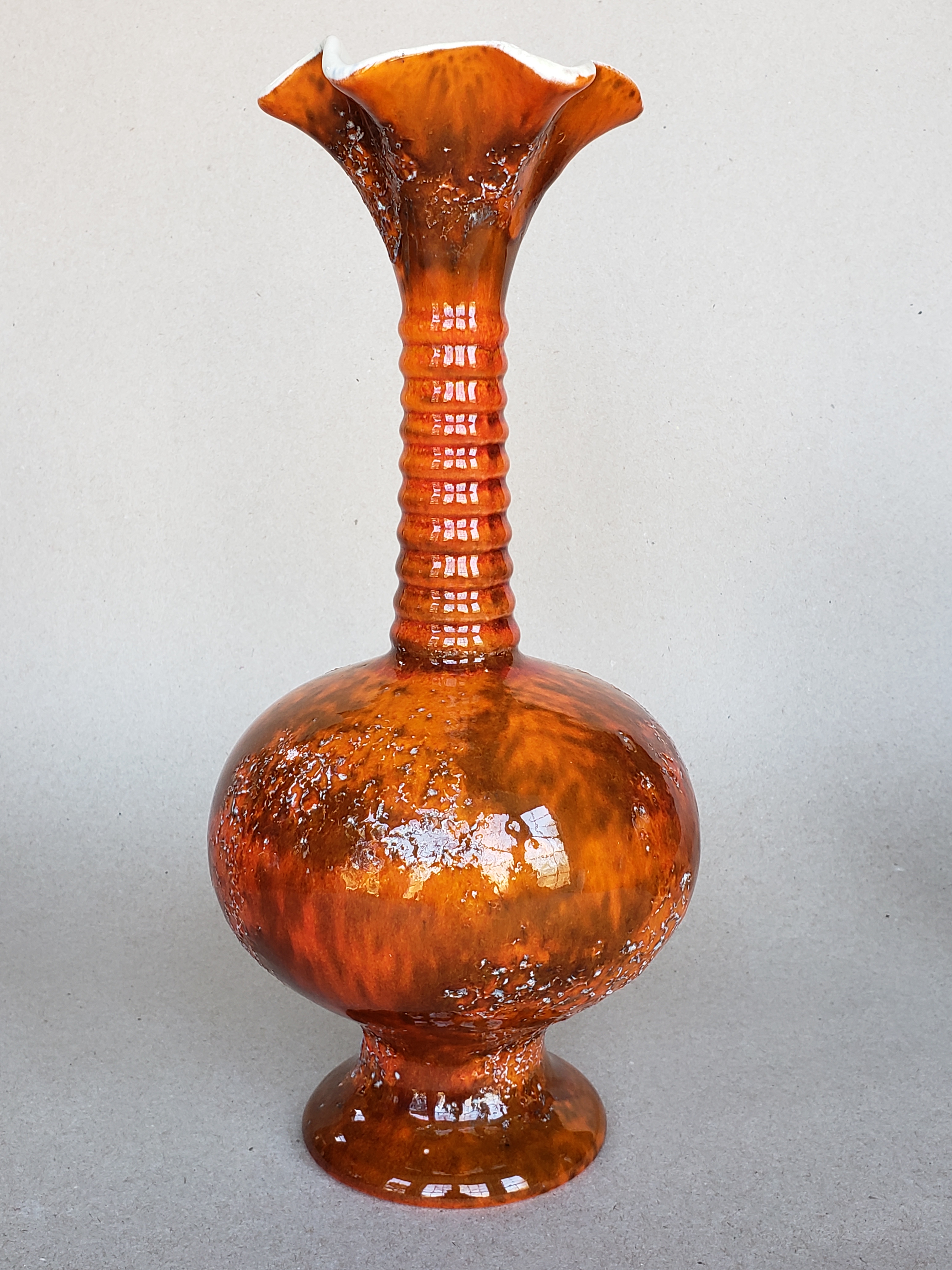 Looking across the pond in the late 60s, Royal Haeger ceramist Helmut Bruchmann decided to take a page from the successful German playbook and try a true lava glaze. He succeeded and “Etruscan,” a line bearing his glaze, was produced. It’s an interesting line, with shapes which evoke Antiquity, some fascinating base glazes, and textures reminiscent of dirt-encrusted treasures pulled from an archaeological dig. The delicate elegance of the line avoided the grandmotherly feeling of Royal Haeger’s other products at that time because of Bruchmann’s granular, naturalistic glaze, but it wasn’t to American tastes — Etruscan only lasted two years, from 1966-1967.