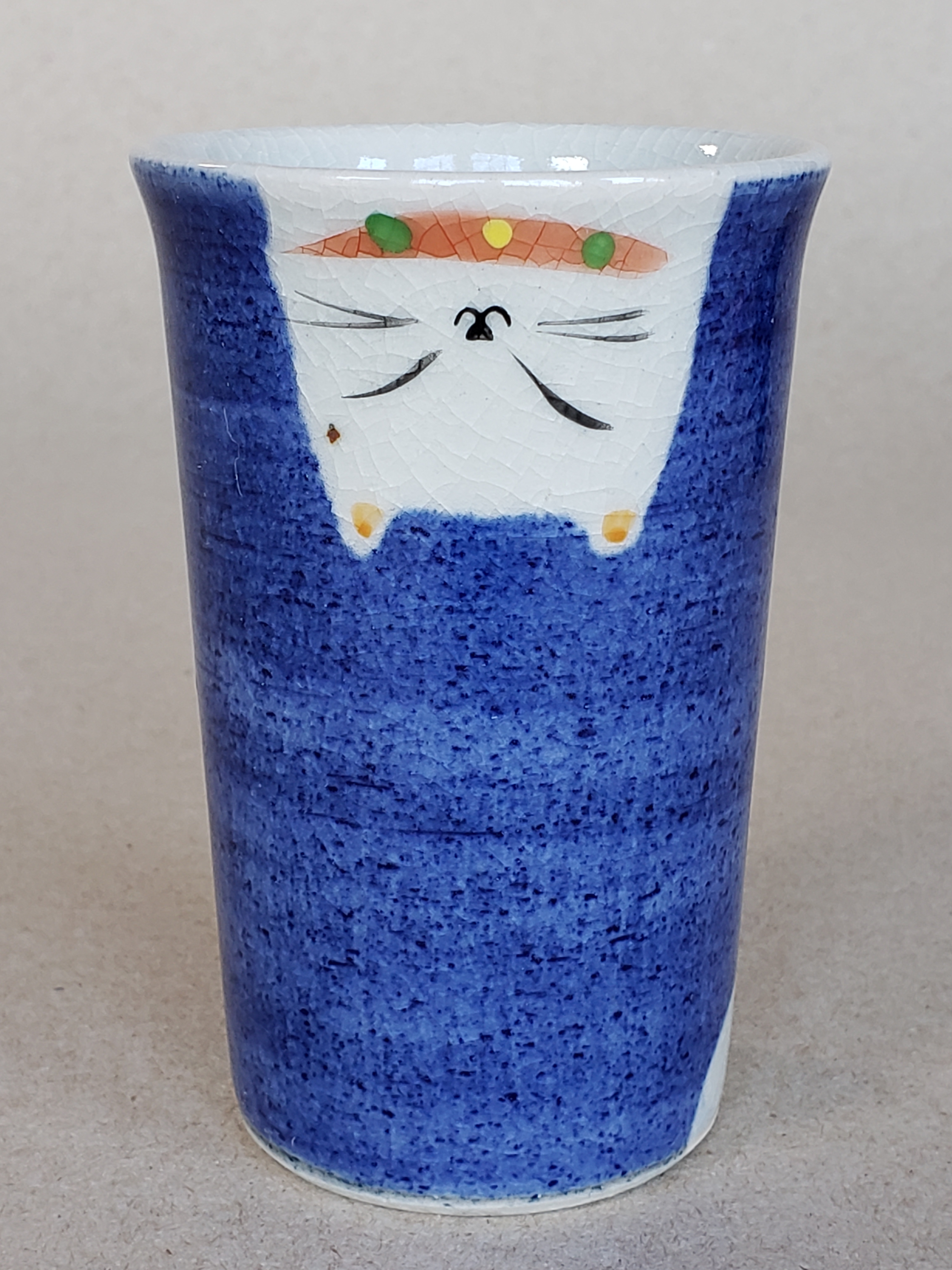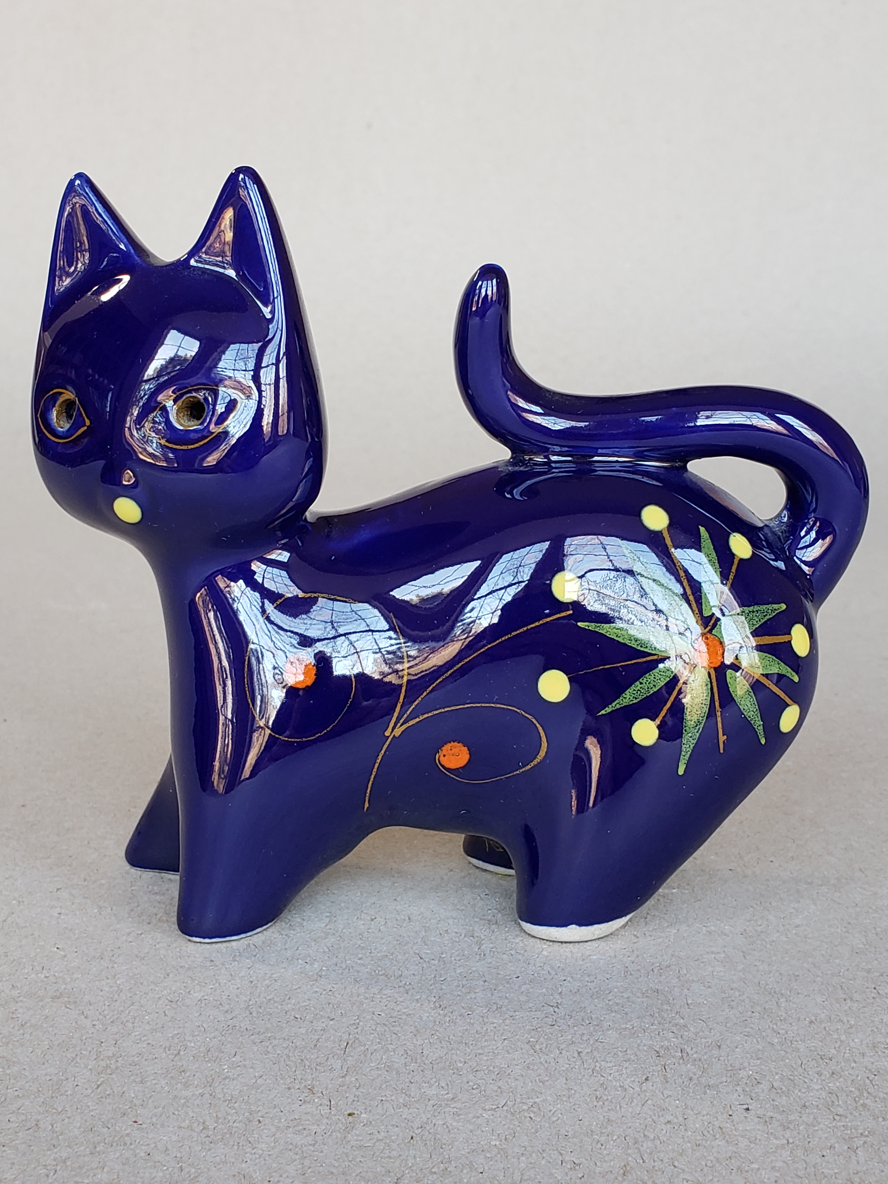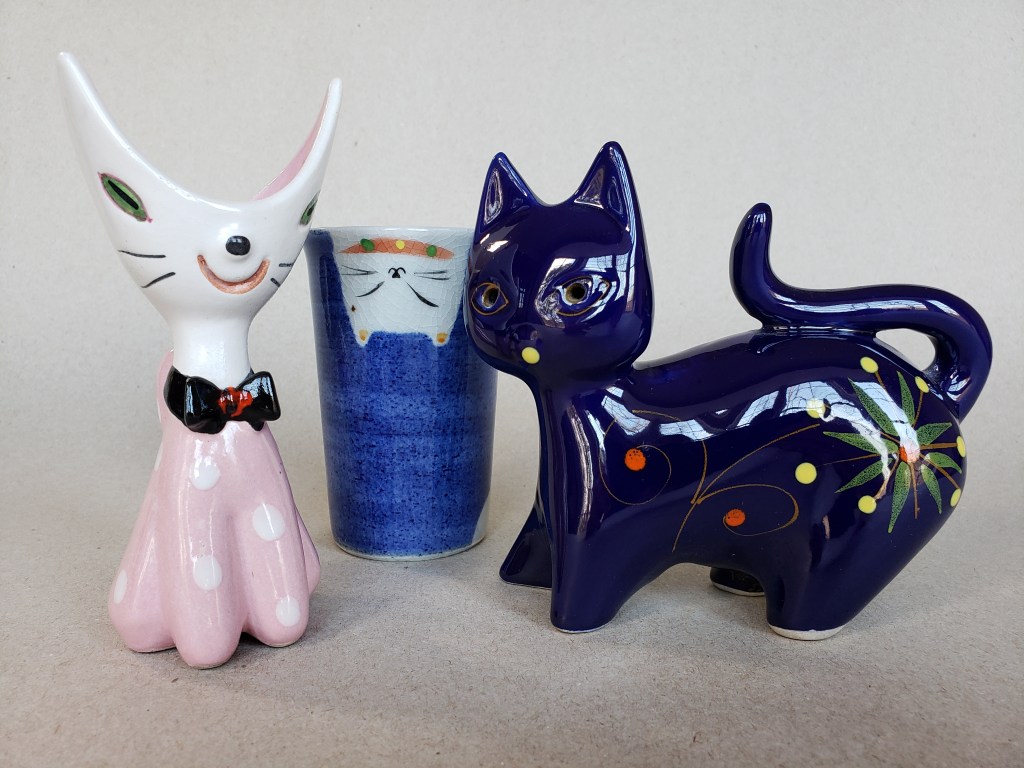 Yes, its ridiculous, ceramic cats. Not only that, a disturbing pink, polka-dotted cat. I don’t know what I was thinking, either. My only defense is they (OK, not so sure about the cup) are a) examples of the mid-century ceramics world and *apologies* b) curiosity killed this cat so I had to buy them. The pink La Freccia (The Arrow, thus the printed symbol on the bottom) cat was designed by Tarcisio Toscin in the 50s-60s; there is a larger blue example featured in Mark Hill’s Book Alla Moda. The dark blue cat, who is marked with a number and the words “Bristol” (perhaps a distributor) and “Italy,” is probably from the 50s. I’ve seen a green cat and an elephant with the same coloring and decor; oddly enough, while both are piggy banks, my friend is not. Last we have the cup… which I am embarrassed to say I have not found the time to have translated. I know next to nothing about this playful design, but the craquelure on it does hint at a respectable age. If I’m wrong, well, cat’s got my tongue.