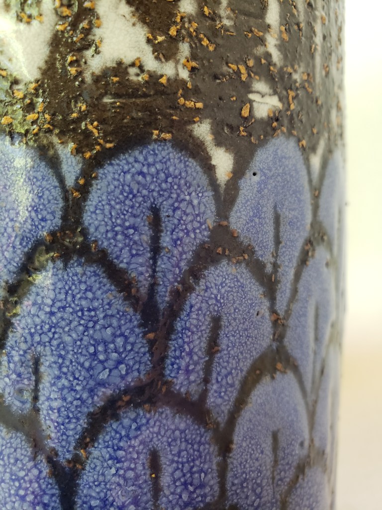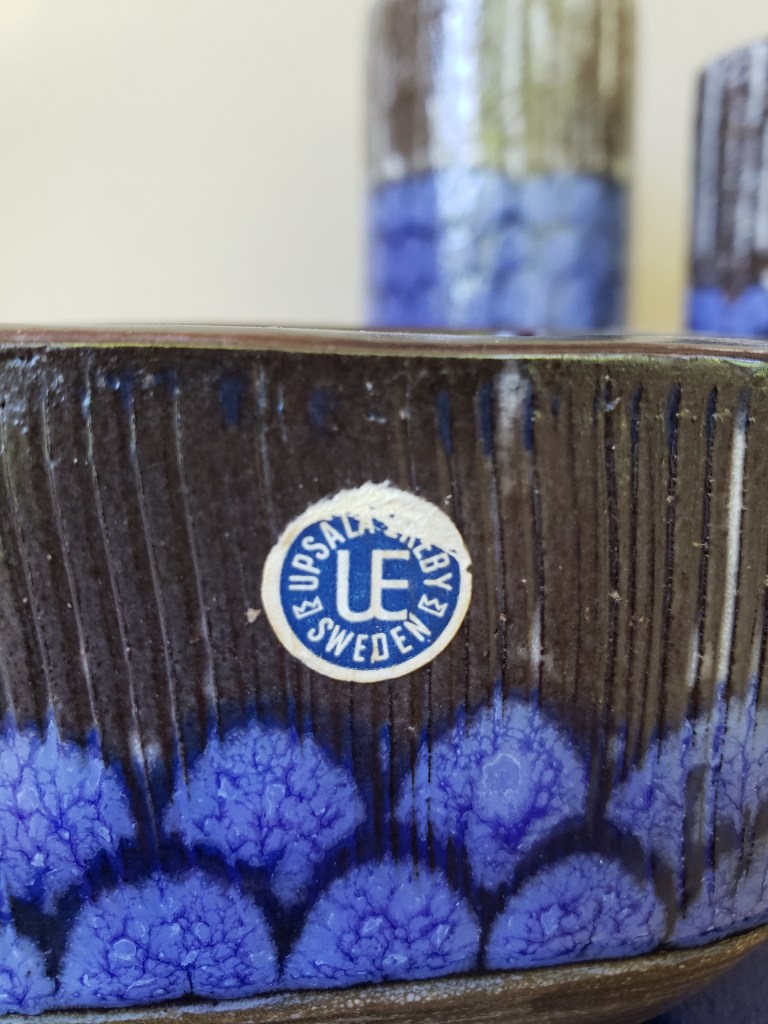 Upsala Ekeby’s prolific designer Mari Simmulson certainly saw things through a different artistic lens. “Fenix” is Swedish for “phoenix,” but I challenge you to find anyone other than Simmulson who has ever envisioned the fiery bird of rebirth as a soft, jewel-toned marvel slyly hiding behind its feathers. Perhaps the name stood for something else? This vase was produced in 1952, when Europe was still casting off the shadow of World War 2. It was a rebirth from the ashes, both literally and figuratively, and one neatly expressed via pieces like these.