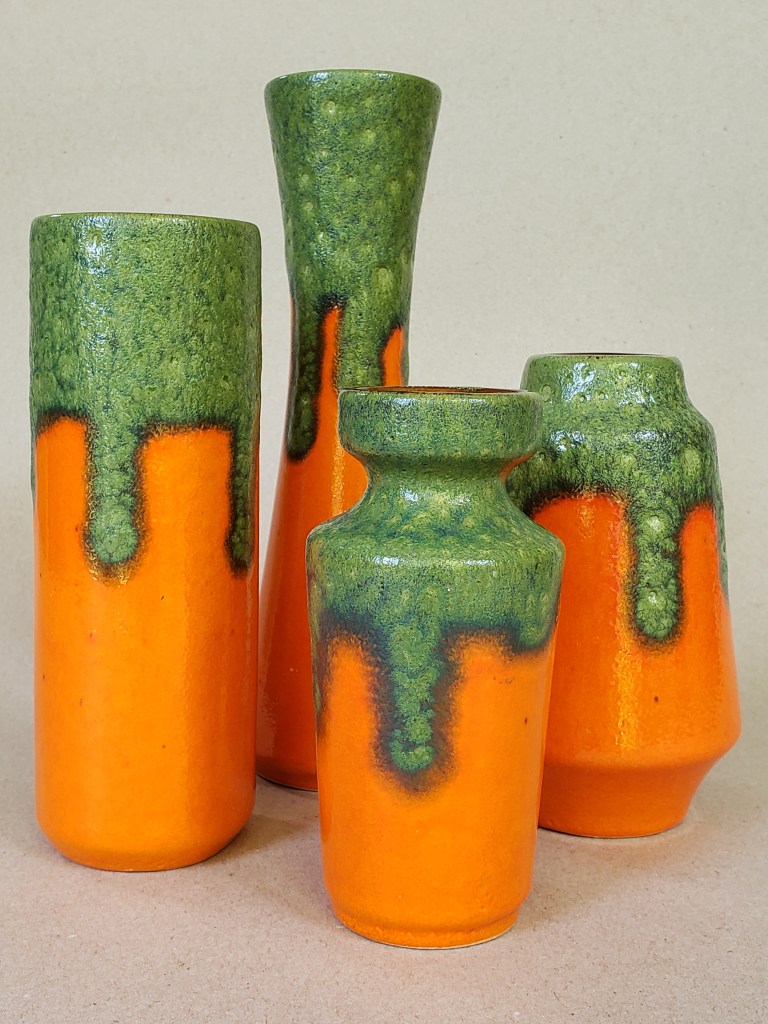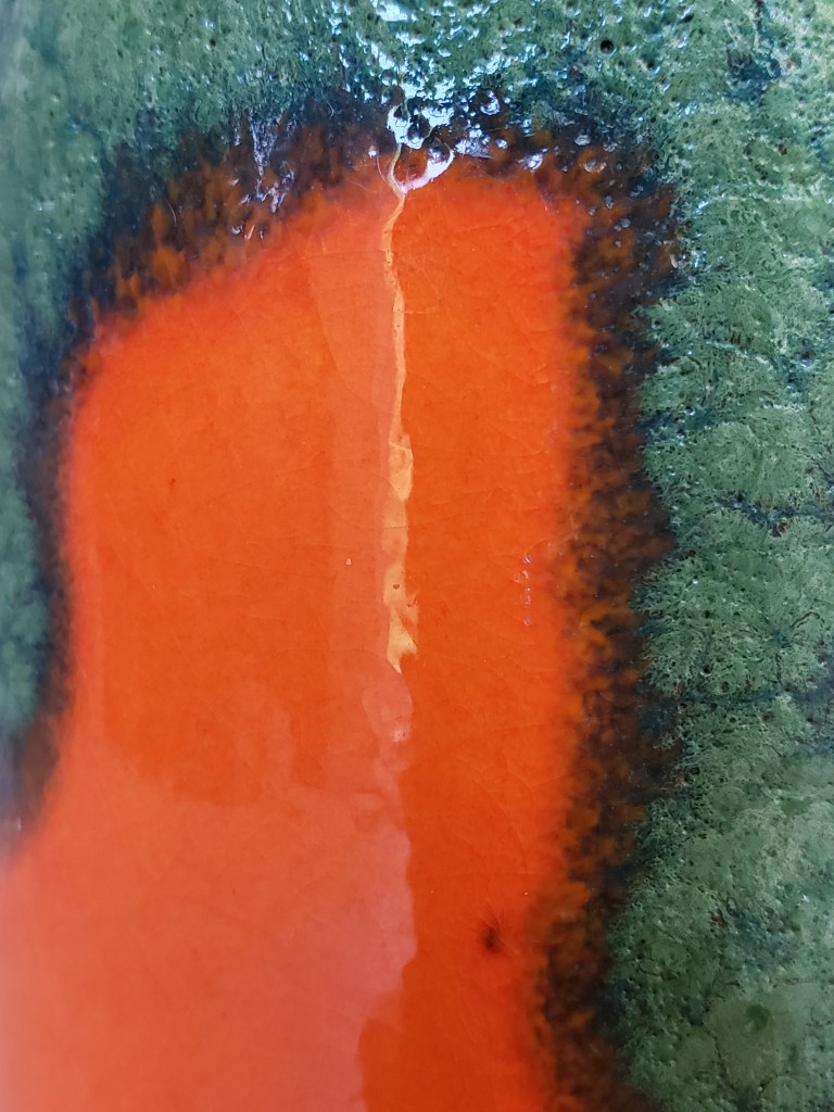 Orange and green are wonderful partners in the natural world — just look at the beauty of a fully-laden orange tree, tall orange zinnias in mid-summer or maple trees bursting with autumnal orange leaves against a backdrop of evergreens. With such inspiration, it is easy to see how Ilkra got the idea for this heavy, lava-like glaze. While I’m not sure how well this combination went over — even in the “anything goes” world of 60s-70s West German ceramics, I haven’t found too many other manufacturers of that time who married the two colors — the glaze has a wonderful sense of life which can’t be denied.