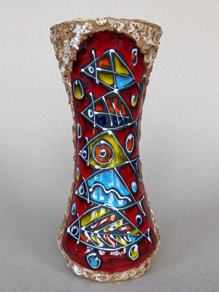 Talented artist Luigi Santi did almost all of his work in the province of Rimini, Italy; the signed “Cattolica” denotes the workshop he founded in the Rimini provincial town in 1961 and ran until his death in 1981. Considering the province sits right on the Adriatic Sea, I had long attributed the fish motif used by numerous Rimini factories to simple proximity to the ocean. I may have been neglecting a bit of religious history, however, which might provide a deeper meaning. Saint Anthony, whose name is invoked by Catholics across the world when seeking a lost item, had an interesting event happen when he visited Rimini to preach 800 or so years ago. According to legend, Rimini was known at that time for its heresy — so much so that Rimini’s leaders instructed the town’s residents to ignore him. When they did so, Saint Anthony walked just outside of town to the mouth of the Marecchia River to pray and reflect. Calling out, “Fish of the river and sea, listen to the Word of God because the heretics do not wish to hear it,” Saint Anthony was rewarded for his faith by the sight of thousands of fish, all pushing their heads through the surface of the water as if straining to hear his every word. The people of Rimini saw this and, so moved by Saint Anthony’s words, returned to the church. A fish story of quite a different color, I think — and one which makes this vase just a little more special to me.