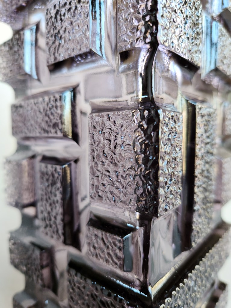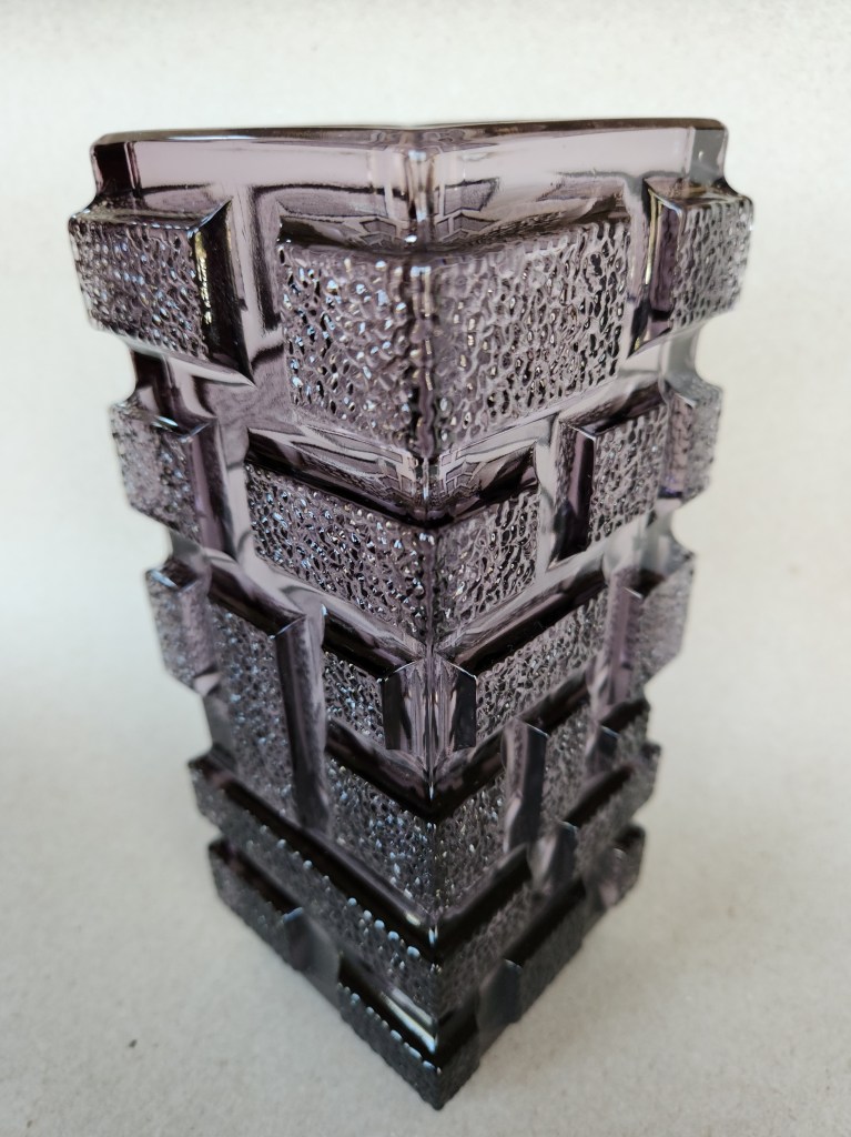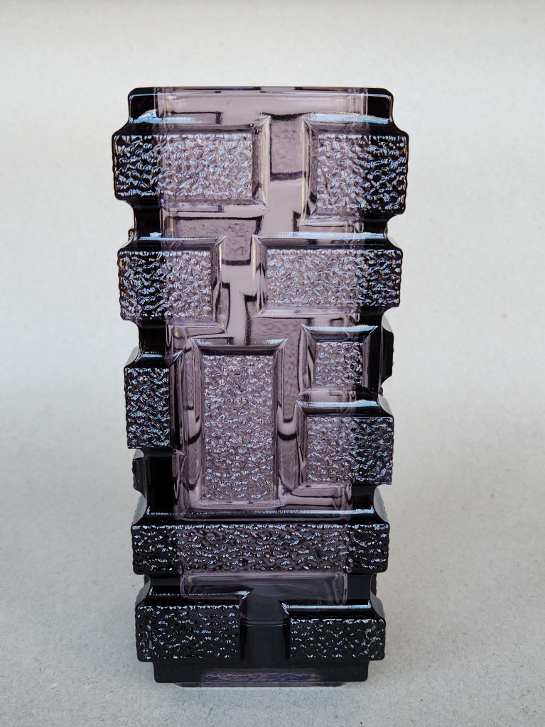 Collecting Mid Century ceramics has been wonderful, but even the most dedicated collector needs to try something new now and then. Mark Hill, the wonderful author of the groundbreaking books Fat Lava and Alla Moda, also wrote a similar book about Czech glass entitled Hi Sklo, Lo Sklo (sklo is Czech for glass). I’ve had the book for years, but over the holidays delved into it (and Mark’s extensive section on world glass in Judith Miller’s tome, Miller’s Mid-Century Modern) so much I decided to buy some pieces to see what the fuss was about. Well, THAT may have been a small mistake, because I think I may have found a new addiction. When I opened the box containing this rather weighty Czech jewel, with its textured “bricks” and pale amethyst coloring, I was impressed that something 50+ years old could look so fresh and so interesting at the same time. The size and shape are eminently practical, perfect for any number of long-stemmed flowers or cuttings — in short, a vase which would perform a good service while looking natural in any modern space today. I was impressed (if you’ll pardon the pun) yet dismayed: If I found this much happiness in one piece of MCM glass, how much would I find in others? Oh no… I can already hear my bank account groaning.