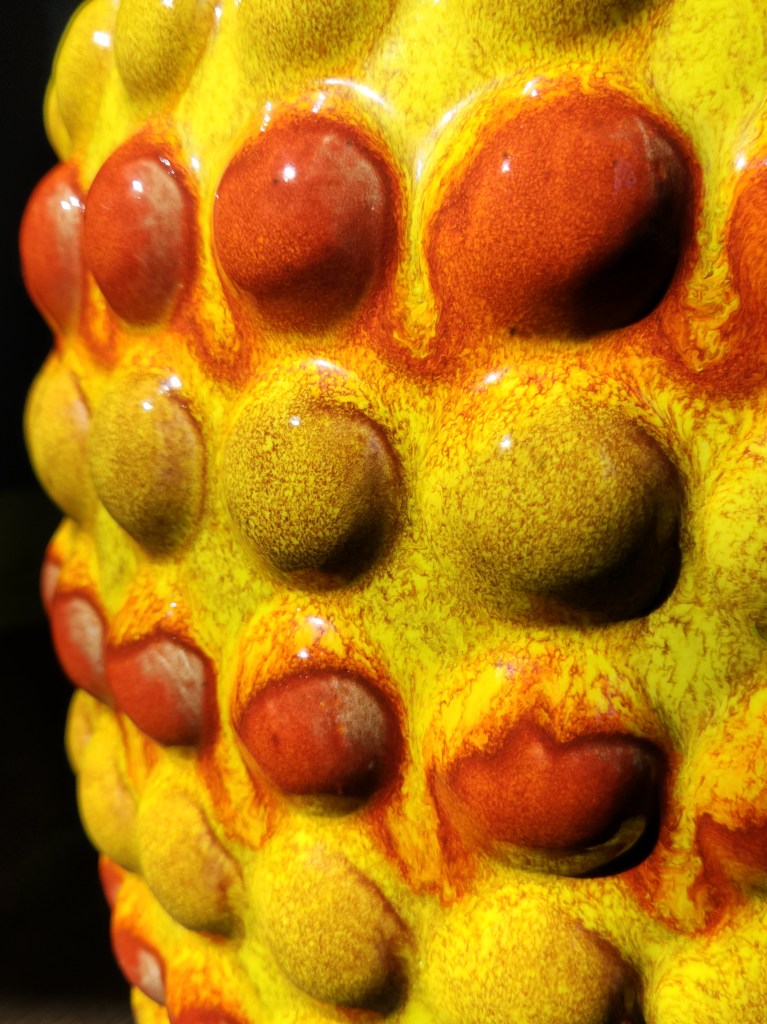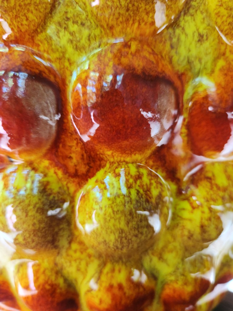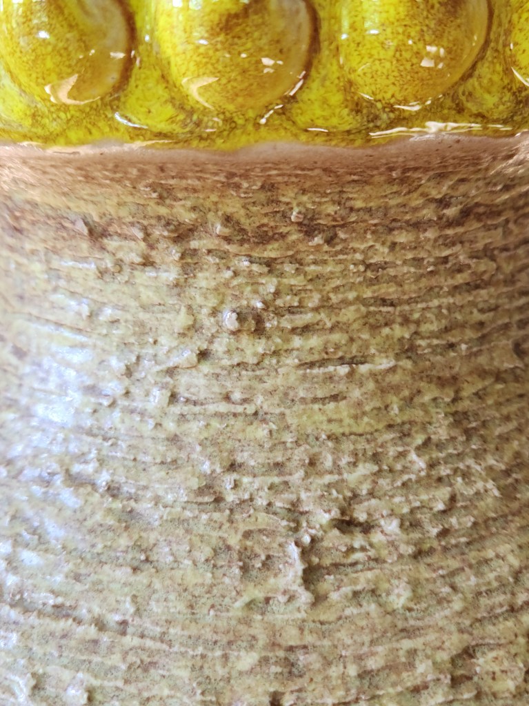 The joy of collecting anything is finding something just a little bit different. In this case, I had been searching for a Bay Keramik 64 or 65 series (aka the “bubble” series) vase for quite some time, but just couldn’t make up my mind due to the variety of combinations available. There were sizes ranging from 14 to 30 cm… myriad color combinations from the orange and yellow above to brown; green; tan and blue; brown with mint and red; brown and orange; etc… and handled (denoted by a 65) and non-handled (denoted by a 64) pieces. Where to start? I was getting to the point where I was just going to buy one of each when this monster popped up online, and I just knew it was the one. And the surprises didn’t end there! The glaze combination is amazing, and paired with the molded bubbles seems to move under sunlight. The neck, despite the rough look approximating a sand-etched Bitossi, is smooth to the touch. Lastly, it is wonderfully light for something meant as an umbrella holder. All in all, a fun find and one which provided fuel for the next search. After all, if you aren’t looking, how will you find it?