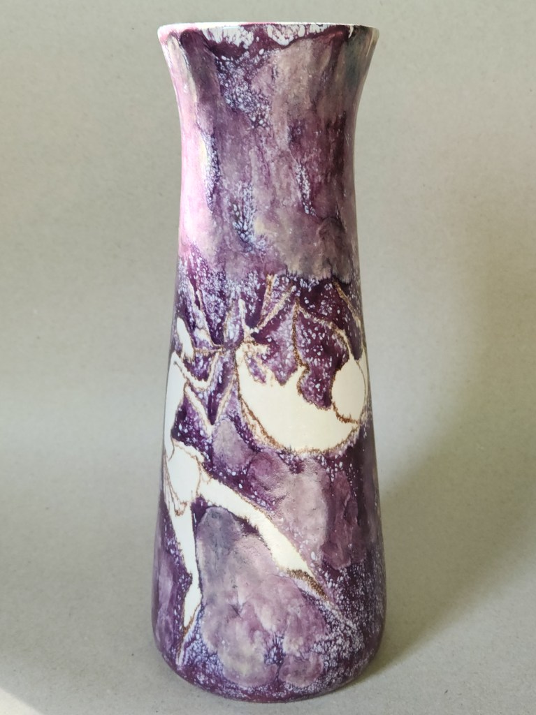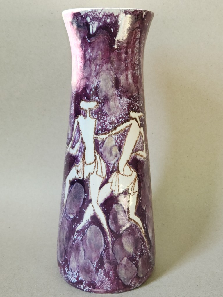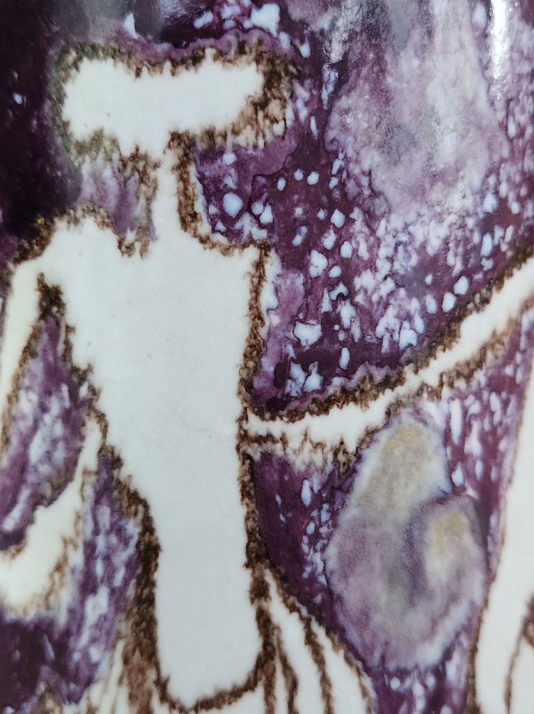 The new piece, like the one in my first post, comes from the late 50s-early 60s when Baldini was primarily decorating using a primitive motif. The treatment of the figures and glaze here, though, is much different from the other piece I own. The earlier, cleaner lines illustrating the warriors are replaced by blurry, watercolor-like lines which interact with the base glaze to give a greater sense of movement. The glaze itself is a flowing mix of poured, spattered and impressed purple-and-white which reminds me of West German glazes of the time, but retains a much higher degree of originality and artistry via the painterly, considered manner in which it is applied. Baldini was known for this: In an undated Italian interview with Vittoria D’Augusto, a Rimini painter and contemporary of Baldini’s, D’Augusto stated Baldini considered ceramics “as a place of high artistic research and not simple craftsmanship.” This piece bears out that approach and highlights why Baldini is deserving of greater appreciation on a scale commensurate with the other mid-century Italian ceramics masters.