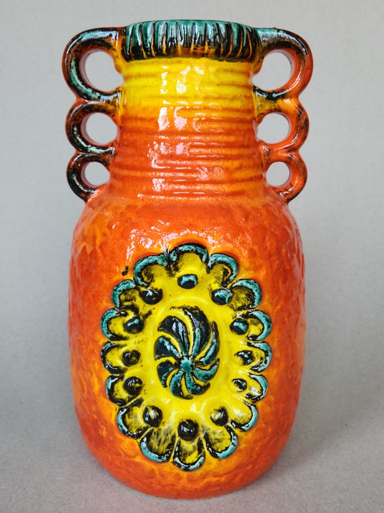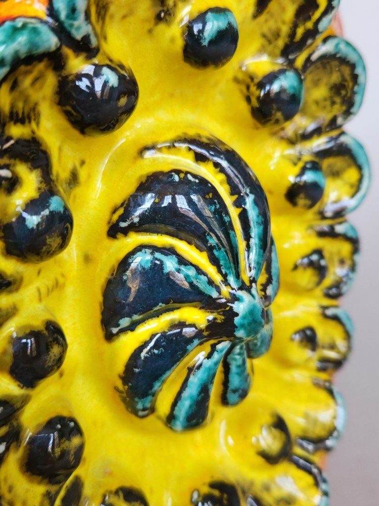 Apologies to Taylor Swift fans, but her line from “Snow On The Beach” encapsulates this vase perfectly. First of all, it is COLORFUL. Yes, all caps. I defy you to find a single, mass-produced product which dares to be as bold as this is (not even Jonathan Adler would go so far). Second, it is weird — not “ick” weird, but that harmless 1970s “I just got back from the ashram in India and I am stoned on mushrooms in my bedroom while listening to Pink Floyd’s The Dark Side of the Moon” weird. Third, the vase is… alive? The surface comprising most of the body is this uneven, undulating texture which seems to pulse with energy, while the flower (?) in the center appears to move on its own accord under changing light as its petals stretch slightly away from the vase toward you. Topped off with what I can only call brass knuckles for handles, it is a festival of strangeness which shocks… repels… intrigues… then, finally, attracts. It is a reminder of how fearless we once were, as producers and consumers — unafraid to expand our definition of beauty outside of the normal boundaries. For that reason alone, I am happy to have such a weird but f**** beautiful vase in my collection.