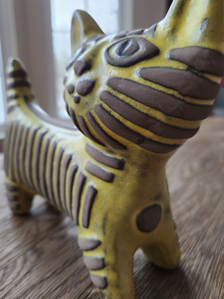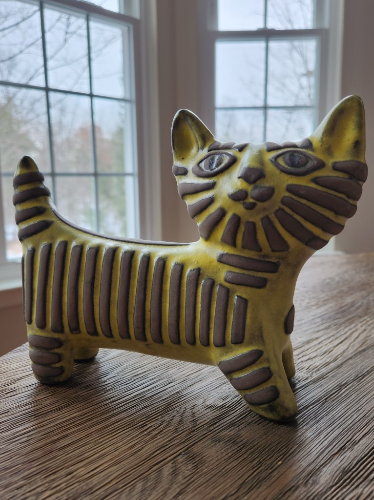 The living room of my home in England contained a jaunty, Provencal yellow wallpaper, something which was slightly off-putting to my American senses… until winter rolled around, with its endless gray skies and daily five (!) hours of the saddest excuse for daylight you will ever see. THAT was when that I realized why the yellow was there — it was the perfect tonic which allowed one to survive all the dreariness and make it to spring. Seeing that it is 21 degrees outside and snow is on the ground, it therefore seems only appropriate to feature this wonderful feline, designed by the prolific and talented Upsala Ekeby artist Dorothy Clough. With his jaunty yellow coat, assertive stripes and je ne sais quoi expression, he isn’t taking winter lying down! It is a feeling I share… but alas, one my own cat does not.