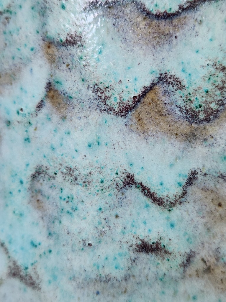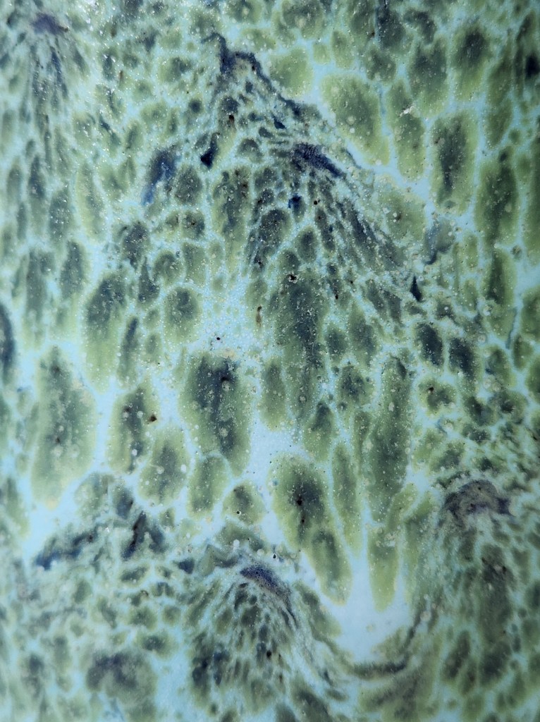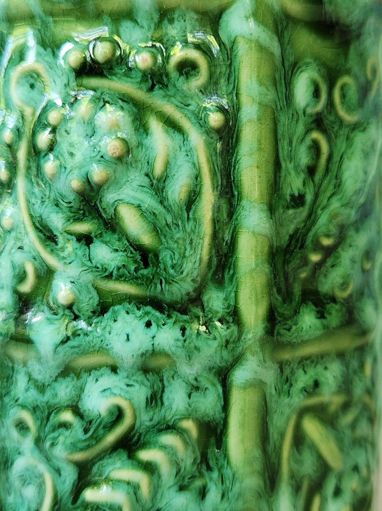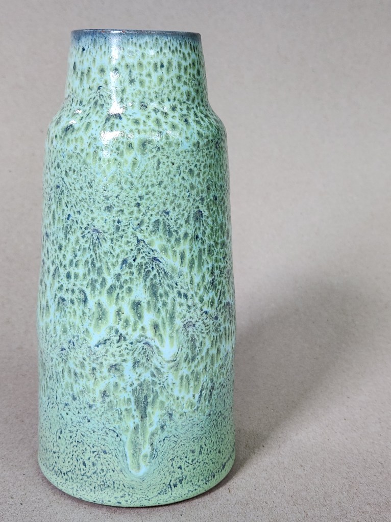 Summer and its unrelenting heat always bring to mind memories of getting away to the ocean or sea for relief. I’ve been fortunate enough to swim in the Atlantic, the Pacific, the Gulf of Mexico, the Carribean and the Mediterranean and each has its own character and color — both of which change depending on the time of year and time of day! These three pieces illustrate the effect nicely. The Gramann Römhild’s undulating seafoam green, which looks almost good enough to dive into, seems to hide a turtle or a ray beneath the surface. The Bay brings to mind high noon in July at Laguna Beach, with giant kelp and sea grasses swirling in the cold water around you. Then there is the Eugene Lion, with its glaze suggesting gentle waves lapping late in the day upon a soft sandy shore — a remarkable feat of glazing, considering the vase was created in France in the early 1900s! It fits in well with its more modern compatriots, though. When it comes to the love of the sea and art, plus ça change indeed!