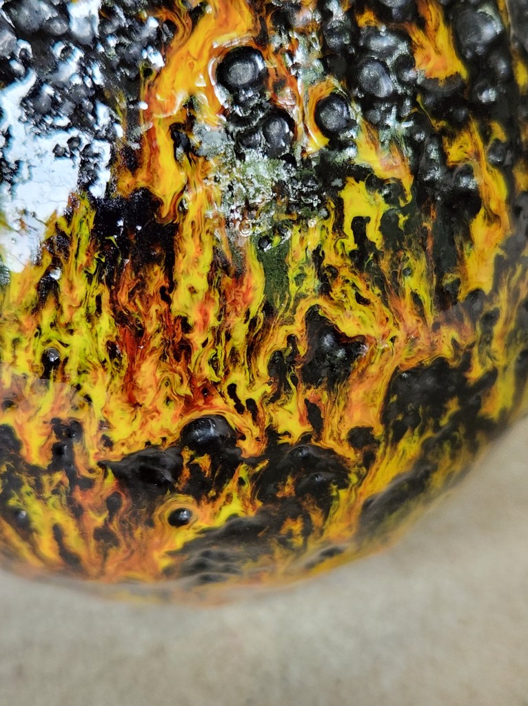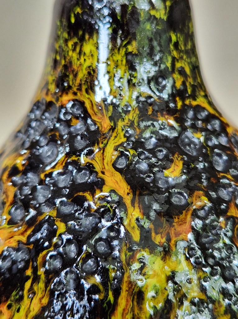 For those of you who have space to display your full collection of ceramics, I envy you. I have several large bookshelves full of books, but only one has space on top where I can (safely) display anything… we did have a serious earthquake a few years back, so the idea of vases taking a swan dive off a more precarious perch is not a remote one. I change the vases up, sometimes according to the seasons, but it makes for a frustrating experience as I can never truly enjoy the depth and breadth of my collection. I did haul half of my vases to an antiques show last winter, where I finally had the chance to create a large display — and even if I hadn’t made a dime from the show, seeing all those wonderful colors and shapes together would have made it all worthwhile. So back to the little piece, here. As 99% of what I own is stored, I sometimes like to open a box and unwrap a vase or two just to remind myself of what I have. One of the vases I plucked out of obscurity this week was this Kreutz, which often slips my memory due to its small size. With its flowing streams of orange and yellow glaze cascading from a volcano-like neck before cooling into a rocky black bottom, it is the true embodiment of the term “lava vase” and displays better than most vases many times its size. And therein lies the problem: WHERE to display it. I’d hate to banish this to the basement again… perhaps a reprieve is in order. Work desk, anyone?